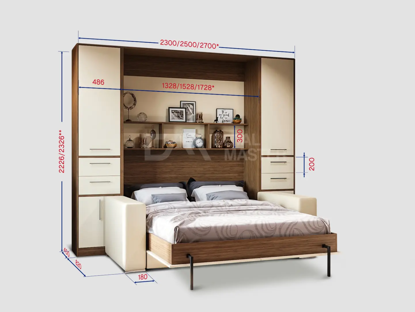 Дополнительные опции, такие как: освещение, зарядное устройство, розетки, мягкое изголовье, матрас - не входят в стоимость шкаф-кровати "Extra Start". Вы всегда можете их добавить в опциях или написав менеджеру при оформлении заказа.